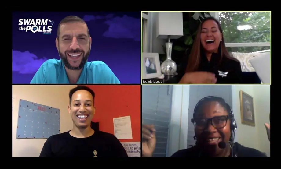 Charlotte Hornets coach James Borrego and in-game host Jacinda Jacobs laugh during a virtual voter education RISE Town Hall with RISE's Shadoe Tarver and Diahann Billings-Burford.