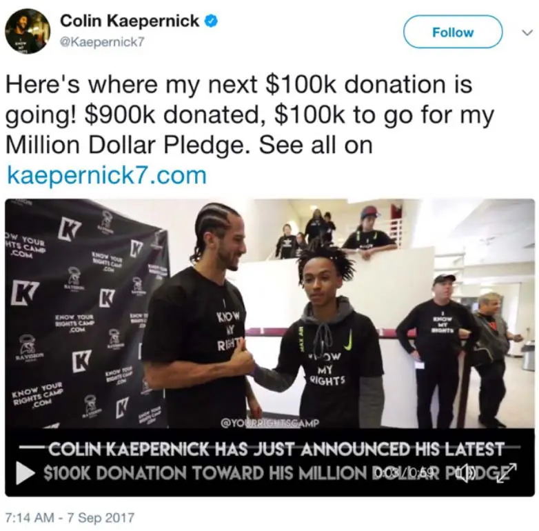 Colin Kaepernick Makes Another $100,000 Donation Toward His $1 Million Pledge